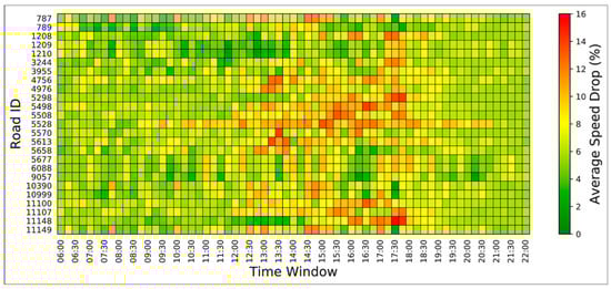Figure 3 shows an example of the STC matrix to illustrate the temporal traffic speed drop caused by weather change on Jakarta’s 25 representative roads. Basically, the x-axis and y-axis represent the time-window and road ID, respectively. The heat map colors changing from green, yellow, to red are used to indicate the relative minimum, average, and maximum vehicle speed drop caused by weather difference (dry vs. raining) under different timing. As can be seen in Figure 3, the “green” regions indicate that the weather changes from dry to rainy cause relatively minimal traffic speed drop during the nonworking hours (before 10 a.m. and after 6 p.m.). During the working hours (between 10 a.m. and 6 p.m.), the “yellow-red” regions show the severe traffic speed drop caused by rain. Through the proposed STC matrix, the roads which have a longer time with the extended speed drop can be detected. For example, road #5528 has a longer traffic speed drop period than the others (10 a.m. to 8 p.m.). Road #1209 and #1210 almost experienced no or minimal speed drop across all time windows. Based on the STC matrix, the impact of weather can be easily analyzed and used for the prediction model.