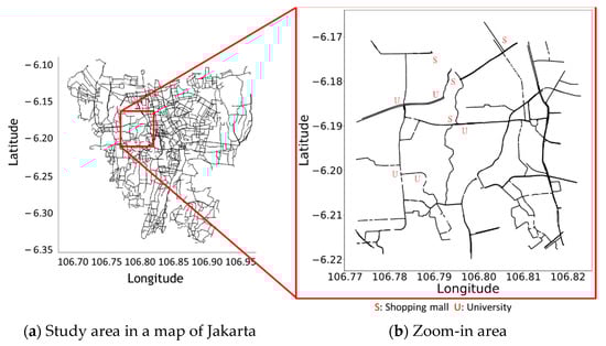 In this paper, the study region, a 5 × 5 km-square area of nonresidential roads in west Jakarta, as marked in red-box in Figure 5a, is used to represented a case study. Figure 5b is the zoom-in of the red-box on the left-hand side. The reason of using this area is because the selected location can represent the condition in Jakarta’s roads in general. In the chosen 5 × 5 km-square area, there are 906 roads, three large shopping mall complexes, business districts, three local universities, the entrance and exit gates of a highway toll road, a commuter station, and plenty of wide and narrow streets. In fact, this 5 × 5 km-square area is the core area of Jakarta city, representing a common urban area in a metropolis of a developing country without losing the generality. The traffic data were aggregated into fifteen-minute intervals from 6 a.m. to 10 p.m.