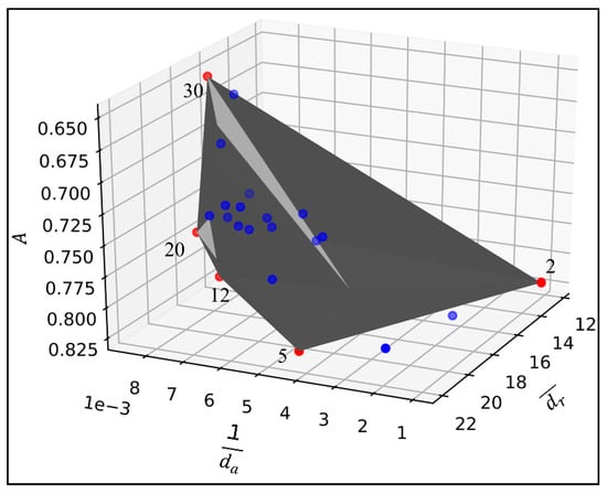 We simulated K-means clustering algorithm with K from 2 to 30 and recorded the results of and . For each K, the prediction accuracies of the RF method were stored together with the and . Then, the selection of best K was conducted based on the Pareto Front method. Figure 6 visualizes the solutions under Pareto surface of the reciprocal of (x-axis), (y-axis), and (z-axis). The grey surface in Figure 6 represents the Pareto frontier area. The edges of the Pareto frontier are the nondominated solutions (red dots) which are not dominating each other in the same solution set. The blue dots are the solutions that are dominated by red dots. From Figure 6, the five nondominated solutions are 2, 5, 12, 20, and 30.