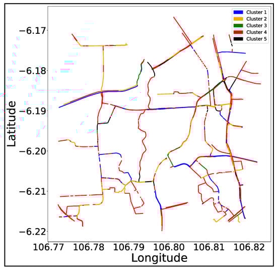 Figure 7 shows the clustering results using . In Figure 7, the blue, yellow, green, red, and black colors indicate the roads in clusters #1, #2, #3, #4, and #5, respectively. Also, the number of roads of each cluster was 92, 159, 573, 61, and 21 for cluster #1, #2, #3, #4, and #5, respectively. Generally, #3 and #5 have relatively fewer roads than clusters #1, #2, and #4, which acquire most of the roads in the experimented area.