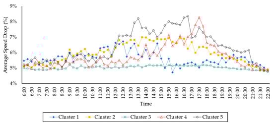 The roads in cluster #5 are closer to shopping malls and relatively far from mosques and schools than other clusters. Uniquely in Jakarta, shopping malls are the main tourist sites and the primary destination for family recreation. Furthermore, people in Jakarta also hang out at shopping malls []. The shopping malls in Jakarta usually open at 11 a.m. and close at 10 or 11 p.m. Therefore, these roads experience the highest average speed drop during the shopping malls’ operational time (see Figure 8).