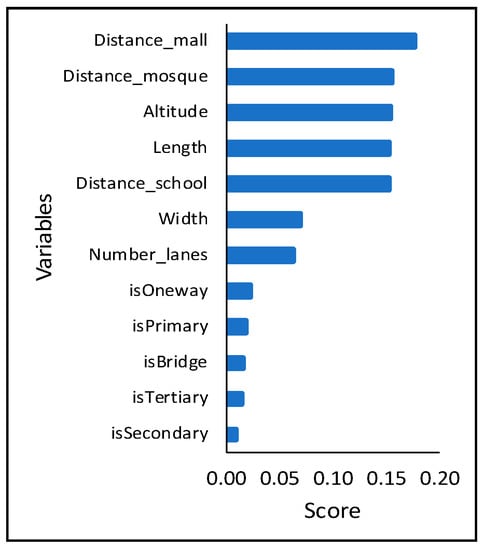 Figure 9 lists the road characteristics with their significance, obtained from RF classifier, from top to bottom based on Table 4. As shown in Figure 9, the most crucial factor, shown on the top, is the distance to the nearest shopping mall, with an importance score of 0.175 from RF method. Other essential variables are the distance to the nearest mosque and school, the altitude, and the roads’ length with the importance score of 0.154, 0.151, 0.153, and 0.152. The roads’ width and the number of lanes are also crucial, with the importance score of 0.081 and 0.072, respectively.