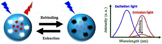 In both of the previously mentioned manuscripts, QDs were covalently bonded to the as-prepared imprinted polymer particles. Encapsulation of QDs during polymerization is another strategy which is used more often to develop fluorescence sensors. In a series of studies [40,41], QDs were embedded within the imprinted polymers to develop fluorescence sensors for dibutyl phthalate (DBP). In the first study [41], Mn-doped ZnS QDs (ZnS:Mn QDs) were synthesized and coated with a thin silica-shell using 3-mercaptopropyltriethoxysilane (MPTS). The as-prepared MPTS-capped-ZnS:Mn QDs (average diameter: ≈4 nm) were coated with imprinted layer using DBP as the template molecule, 3-aminopropyltriethoxysilane (APTES) as the functional monomer and tetraethoxysilane (TEOS) as the cross-linker. Rebinding of the template molecules decreased the emission wavelength (λem ≈ 610 nm) of embedded QDs (the excitation wavelength, λex, was set at 342 nm). The imprinting factor of 3.56 was calculated by dividing the Stern–Volmer constants (Ksv: it is the product of the quenching rate constant and the fluorescence lifetime in absence of added quencher [109]), which were obtained for MIP- and NIP-modified sensors (Table 1). In another study by the same group [40], silicon dioxide (SiO2) nanoparticles (diameter: 200–300 nm) were synthesized and modified with vinyl groups using 3-(methacryloyloxy)propyltrimethoxysilane (KH-570). The vinyl functionalized SiO2 nanoparticles were coated with a thin imprinted polymer layer (thickness: 5 nm) by precipitation polymerization using DBP as the template molecule, acrylamide (AM) as the functional monomer and ethylene glycol dimethacrylate (EGDMA) as the crosslinker in the presence of vinyl-functionalized ZnS:Mn QDs (diameter: ≈4 nm). The prepared SiO2@QDs@MIPs were characterized and used as fluorescence sensor for DBP detection in water sample. The imprinting factor was calculated at 2.09, which was lower than the previous study. However, the LOD was improved due to higher sensitivity (Table 1).