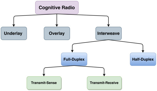 CR has been introduced as a potential candidate to perform complete Dynamic Spectrum Allocation (DSA) by exploiting the free frequency bands that are aslo called “spectrum holes” or “white spaces” [6,7,8]. Being capable to identify these spectral opportunities, CR classifies the users into two categories: licensed, i.e., the Primary Users (PUs), and unlicensed, i.e., the Secondary Users (SUs). While PUs can access the spectrum whenever they want, SUs are restricted by the activities of PUs. In other words, SUs should respect the PUs’ Quality of Service and harmful interference coming from SUs to PUs transmission is prohibited. Therefore, three paradigms of CR can be distinguished according to the possibility of co-existence of SU and PU transmissions in the same channel, the permitted transmit power of SU and the cooperation between SU and PU. As shown in Figure 1, three main paradigms of CR can be distinguished: