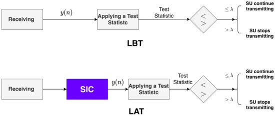 Spectrum Sensing processes under LBT and LAT. For LBT, no Self-Interference Cancellation (SIC) module is required since there is no simultaneous Transmit-Sense (TS), and the Test Statistic may be directly applied to the received signal. By contrast, SIC is applied before evaluating the Test Statistic in LBT to reduce the effect of SI on the Spectrum Sensing (SS) performance.