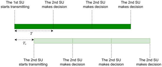 Before the secondary system starts with the TR mode, it makes a traditional SS period in order to detect the vacancy of the primary band. This SS operation lasts while the PU band is occupied [65,76,77,78]. Once the PU band is identified as vacant, SUs start communicating using IBFD. In order to minimize the interference to the PU, an asynchronous transmission was proposed [65,76,77]. In asynchronous transmission, one of the two communicating SUs makes a delay of with respect to the transmitted frame of its peer. As presented in Figure 4, the decisions made by SUs at the end of each frame are delayed by with respect to each other. For an optimal value of [65], the CR network makes a decision on the PU status each sec instead of T sec if synchronous transmission is adopted between SUs. This asynchronous transmission helps the SUs to enhance monitoring the PU activity as the latter may access the channel at any time.