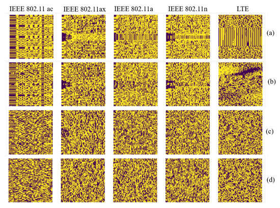 The simulation for each IEEE 802.11 protocol and LTE standard has been run independently to generate signals and save the radio spectrogram images for and , under various channel scenarios and SNR values. The radio spectrogram images correspond to as many preambles for each IEEE 802.11 protocol and LTE subframes.