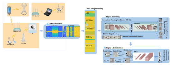 To study the proposed system’s performance, first, a simulation environment is developed for LTE and WLAN 802.11 standards. Second, the data are generated and collected under different SNR values and channel propagation models. Third, data preprocessing is performed to prepare the DL model’s data by mapping the signals to the corresponding spectrograms. Fourth, the signal denoising is performed for each dataset to reconstruct the corrupted received signal spectrogram for each protocol using Convolutional Denoising Autoencoders (CDAEs). Finally, a signal classification is performed to identify the received protocol using CNN classifier model taking into input the CDAE representation. Figure 3 illustrates the proposed system for using DL.