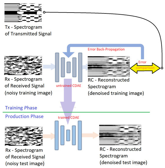 Schematic view of the operation for signal denoising using a Convolutional Denoising Autoencoder (CDAE). The input is noisy data (spectrograms of the received signal under various channel propagation scenarios). The encoder and decoder consist of multiple convolutional layers: the output is compared to the clean signal’s spectrogram. By optimizing the loss function, the network finds a denoised representation [62].