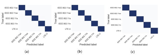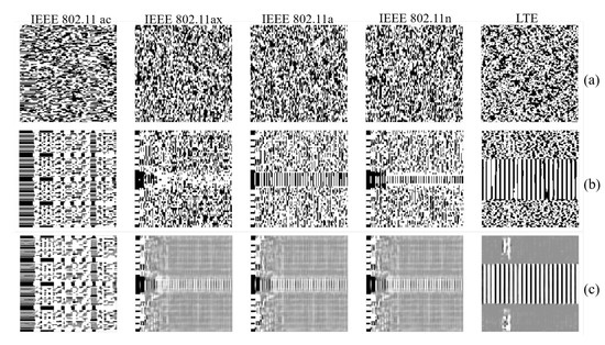 We focused on Wi-Fi signals operating in the 5 GHz industrial, scientific, and medical (ISM) band in our experimentation. The selection of this unlicensed band is due to LTE, which can operate in the 5 GHz band, based on the operators’ preference [68]. To the best of the authors’ knowledge, there is no available dataset for wireless local area network (WLAN) 802.11 protocols or LTE, especially under multiple noise scenarios and propagation models; therefore, we resorted to data generated through simulation. We set up the simulation of the following five protocols operating in ISM bands: LTE, IEEE 802.11ac, IEEE 802.11ax, IEEE 802.11n, and IEEE 802.11a under different channel conditions. Protocols and conditions will be further detailed in Section 4.2. IEEE 802.11ax is the high throughput and efficiency WLAN amendment, which will replace both IEEE 802.11n and IEEE 802.11ac [69,70]. The end-to-end radio signal environment is built using the MATLAB WLAN System Toolbox for various WLAN 802.11 standards such as IEEE 802.11a, IEEE 802.11n, IEEE 802.11ac (Wi-Fi5), and IEEE 802.11ax (Wi-Fi6). MATLAB also includes LTE System Toolbox, which is used to build, design, and generate LTE waveforms and model end-to-end LTE communication links. The propagation of channel modeling functions allows fading and noise to the transmitted LTE and WLAN signals. In the following subsections, the implementation system for WLAN IEEE 802.11 protocols and unlicensed LTE is explained. The simulation setup details for LTE and IEEE 802.11 standards, the characteristics, the channel conditions, and the received signal for each protocol or RAT are all detailed in Appendix B.