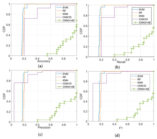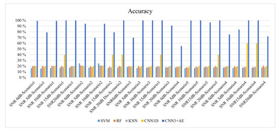 The 4-layer MLP with and without CDAE, the 6-layer CNN classifier with and without CDAE, the 8-layer CNN classifier with and without CDAE, and the 13-layer CNN classifier without CDAE are stuck at a accuracy across the whole considered range of channel scenarios and SNR levels. Overall, they perform as a random classifier. The CDAE representation with 24 layers, on the contrary, features an accuracy ranging from to for multiple protocol classification, depending on the noise and SNR values. CNN3 + AE performing better than CNN2 + AE suggests that adding one CNN layer helps to extract more features, which are useful for identification. Finding the dimensionality of the CNN which corresponds to the coarseness of data representation where the “right” features emerge is a classic problem, part of the CNN model’s hyperparameter tuning. We want to highlight that we explored both a lower number of layers and a higher number of layers. As it often happens, there is an optimal point in the complexity of a network that represents a good trade-off between bias and variance: the CNN3 + AE represents such a good trade-off. On the contrary, we found that the CNN2 + AE performance does not generalize well across all the datasets, while already the CNN4 + AE shows a clear sign of overfitting: we assume that increasing the number of layers thus further increasing the number of parameters would produce an even more apparent overfitting. Therefore, we did not experiment with CNN5 + AE, CNN6 + AE, and so on.