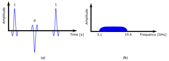 UWB communication pulses. (a) Time–domain behaviour. (b) Frequency–domain behaviour.