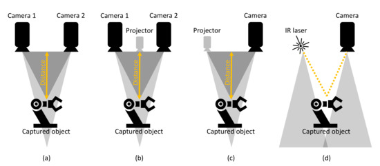 Depth cameras are the result of progress in research and the decreasing costs of depth sensors integrated with RGB cameras. This has led to the implementation of Red Green Blue-Depth (RGB-D) images, which define the RGB values and the distance between the RGB-D sensor of the camera and the captured object of interest. As mentioned in [42,43], depth information is obtained by stereovision [44], time of flight (TOF) [17,45], or structured light [46] depth cameras. The described types of depth cameras are shown in Figure 3. According to [42,43], the working principles of depth cameras can be shortly described as follows: