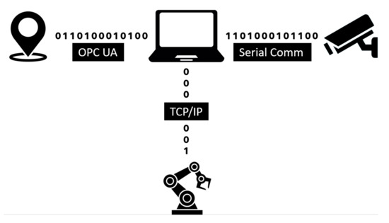 The primary workplace components used for this article’s preparation were a KUKA KR3 R540 robotic manipulator (the main specifications can be found in the datasheet [47,48]), a Stereolabs ZED depth camera (the datasheet can be found in [49]), a Pozyx UWB real-time location system (details can be found in [50]), a Photoneo PhoXi 3D scanner (details can be found in [51]), an internally developed supply trolley, and a computer. The entire process can be split into two parts. The first is robot control, consisting of the bin picking of objects performed by the robotic manipulator and an automated supply by the mobile trolley. The second part is the supervisory control that monitors and zones the robotic manipulator’s working environment and, depending on the external stimuli, adjusts the performed task’s speed. Safety zones are then created using the input data from the depth camera. The UWB-based location system operates concurrently to monitor the spatial position of the tags. The depth camera is directly connected to the computer. In contrast, the RTLS system is first connected to an embedded platform that uses the OPC Unified Architecture (UA) protocol to communicate with the computer. The computer then evaluates the input data and sends the information using the TCP/IP protocol to the robot control system. The data received by the robot control system are processed by the KUKA user interface KSS (KUKA.SystemSoftwarere), more precisely by a submit file (SF). The SF is a background process inside the user interface, responding cyclically to changes using its preprogrammed logic. In other words, the SF is superior to the user interface. In this case, the SF sets the speed or halts the robot motors based on the computer’s input data. The KSS user interface contains functions for the trajectory planning of the robotic manipulator, and these functions are slaves to the SF settings. A simplified architecture and the method of communication between the components of the security workplace are shown in Figure 5.