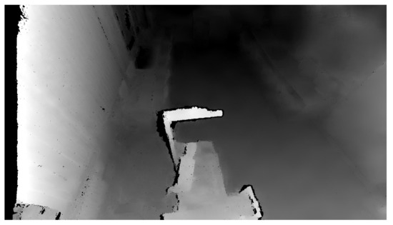 To create the safety zones, the principle whereby an initial reference recording of the room is created to which each measurement is compared was used. The reference recording contains the distance of each pixel to the center of the camera. The initial scan quality is critical, as any error is transferred to all the other measurements. The Python programming language offers the OpenCV library that enables two images to be compared and find the differences. This work does not compare camera recordings based on changes in the colour component but rather changes in depth. Therefore, it is necessary to convert the Point Cloud data into a form used by the OpenCV library by removing the RGBA element using the method contained in the NumPy library. The depth change between the reference and the actual recording is defined as . For this subtraction operation, we use the subtract method included in the NumPy library: . with the same dimensions as the image, where information about the RGBA component is eliminated and information about the size of the coordinate change in the X, Y, Z axes is retained for each pixel—i.e., . Figure 6 illustrates the output from the depth camera.
