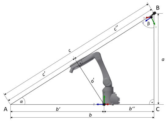 where , , and represent the displacement for each pixel read from and , , and are the distances between the center of the camera and the center of the robotic workplace. The camera is 2.5 m above the ground and 0.9 m behind the robotic workplace, and, in addition, is rotated at an angle of 45°. The camera axis is the same as that of the robot axis and thus . The values and are subsequently computed using Formulaes (11) and (12), which stem from Figure 9. Figure 9 shows the relative positions of the robot and camera coordinate systems.