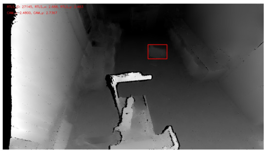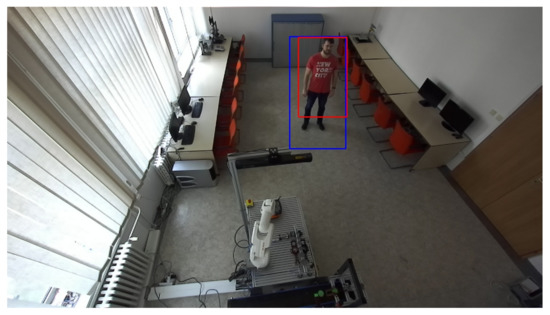 The human recognition subroutine is part of the algorithm for identifying objects from the depth recording. Every object that enters the workplace is identified through the change in depth and marked with a contour. The contour is defined using the coordinates of the left lower point and the width and height. The identification of humans alone is not sufficient to verify whether there really is a person in the workplace. A better option is when the same pixels, representing the depth change and human identification, overlap. It is possible to verify overlap using the conditions or and or , where and are the coordinates of the lower left and upper right point of the box, indicating a potential person in the image. Similarly, and are the coordinates of the contour bounding the depth change. If none of the conditions apply, there has been an overlap. Figure 10 and Figure 11 show the identification of an object from the depth recording and the verification of a person’s presence in the same recording.