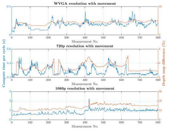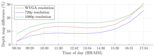 A switch to a higher camera resolution causes an increase in measurement or background noise, which can be seen on the graphs on Figure 13, Figure 14, Figure 15 and Figure 16. The Testing workspace does not have adequate protection against adverse lighting effects. The depth camera’s principle is based on passive stereo, therefore the sunlight strongly affects the lightning conditions. This impact is shown in the second graph in Figure 15, where the brightness changes continuously during the measurement, together with external lighting conditions interfering with the robotic workplace. Meanwhile, the graph in Figure 17 shows the effect of outdoor lighting condition changes during the day when comparing the reference image with the actual image. The reference record was made in the morning when the sun was shining into the room. A subsequent comparison of the current record with the reference shows that the sun’s rays stopped entering the room at around 09:30. Between 09:30 and 14:30, the lighting conditions were relatively constant, and sunset began around 14:30. To solve this problem, it is necessary to add a reference image refresh function after some time when no moving objects are detected. This reference refresh could solve the issue of significant light differences over time in workplaces. A more extended algorithm computation time means an increase in the safety system’s total reaction time and thus a necessary enlargement of the safety zones.