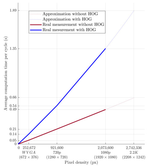 The evolution of computational time per cycle with respect to image quality is shown in Figure 18. Based on the approximation of the data obtained from the measurements, it is possible to predict the average calculation time for the depth camera’s 2.2K resolution. The prediction is shown in Figure 18 and should be around 0.66 s without HOG and around 1.89 s with HOG. A higher camera resolution does not allow for the quick detection of a person’s presence within the monitored workspace. However, this deficiency can be compensated for by increasing the safety zone.