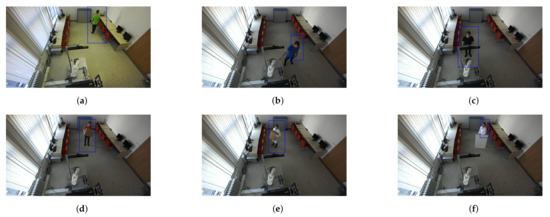 Validation of human recognition for various cases. The blue rectangle represents a potential person identified using the HOG algorithm. (a) A person wearing a green shirt. (b) A person wearing a blue shirt. (c) A person wearing a black shirt who is partially visible. (d) A person wearing a red shirt holding a small box. (e) A person wearing a white coat and holding a big box. (f) A person wearing a white coat behind a whiteboard.