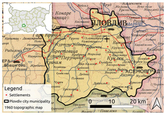 Study area of the city municipality of Plovdiv (black outline) overlaid on a georeferenced historic administrative map from 1960 and the location of the sampled 39 settlements (red points). Inset image presents the relative location of the city municipality of Plovdiv in the context of Bulgaria. The historic background map was issued by the Bulgarian State Directorate of Geodesy and Cartography under the title of “Administrative map of People’s Republic of Bulgaria”, ID KpIV314, designed in 1960 and printed in 1963.