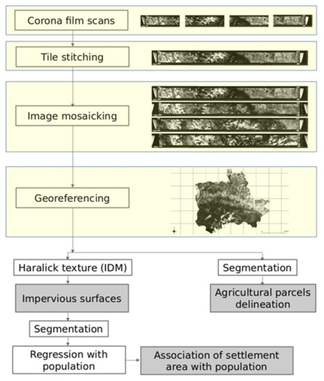 The Corona satellite program was a historic reconnaissance mission which provided high spatial resolution panchromatic images during the Cold War era. Nevertheless, and despite the historic uniqueness and importance of the dataset, efforts to extract tangible information from this dataset have primarily focused on visual interpretation. More sophisticated approaches have been either hampered or unrealized, often justified by the primitive quality of this early satellite product. In the current study we attempt to showcase the usability of Corona imagery outside the context of visual interpretation. Using a 1968 Corona image acquired over the city municipality of Plovdiv, Bulgaria, we reconstruct a panchromatic 1.8 m spatial resolution georegistered image with a relative displacement Root Mean Square Error (RMSE) of 6.616 (for x dimension) and 1.886 (for y dimension) and employ segmentation and texture analysis to discern agricultural parcels and settlements’ footprints. Population statistics of this past era are retrieved from national census and related to settlements’ footprints. An exponential relationship between the two variables was identified by applying a semi-log regression. The high adjusted R2 value found (76.54%) indicates that Corona images offer a unique opportunity for population data analysis of the past. Overall, we showcase that the Corona images’ usability extends beyond the visual interpretation, and features of interest extracted through image analysis can be subsequently used for further geographical and historical research.