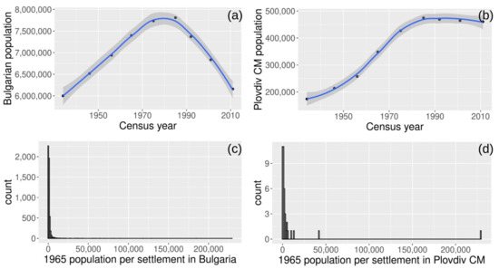 Temporal change in total population for Bulgaria (a) and per settlement within the Plovdiv City Municipality (CM) (b) based on Census decadal data and distribution of settlements (bin of 1000) for Bulgaria (c) and the study area (d) in the year 1965.