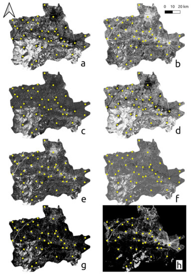 The Haralick texture analysis was then applied as in similar studies (e.g., [39]). The features of energy, entropy, correlation, Inverse Difference Moment (IDM), inertia, cluster shade, cluster prominence, and Haralick correlation were extracted. The IDM was selected as the layer with the best discriminatory power after visual evaluation. A segmentation of the latter based on the connected components algorithm provided the segments of the impervious surfaces representing the settlements’ areas. In the case of five settlements, the segmentation did not distinguish sufficiently between the urban extent and the surrounding possibly agriculture activity, and therefore, we refined the segments manually. Finally, the settlements encompassed by the study area were extracted from the map product through a clipping operation and were judged against the census data through the EKATTE number.