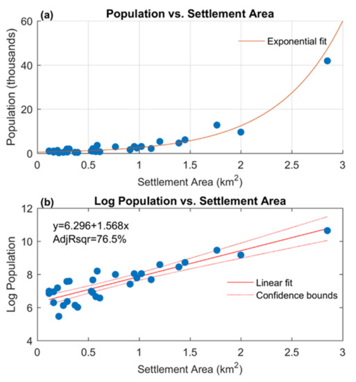 Results showed that the exponential model yields a better fit (adjusted R2 = 76.54%) than the power model (adjusted R2 = 59.62%). To estimate the exponential model parameters we fitted a simple linear regression model (Equation (2)) to the observed data with response logPopulation and predictor Settlement Area, which outputs an estimate for slope r = 1.568 (p-value = 1.5792 × 10−10) and intercept a = 6.296 (p-value = 3.1495 × 10−26), (Figure 7), and F-test = 95.6 (p-value = 1.58 × 10−10). A slope or r = 1.568 indicates that an increase in 1 km2 results in population growth by 100er% = 479.7%. From the demographic perspective, this means that a settlement 1 km2 larger than another has nearly five times larger population. As the linear fit of the model is high (adjusted R2 = 76.54%), we argue that it is feasible to estimate the population of similarly-sized settlements in nearby municipalities and provinces using Corona images of the same period.