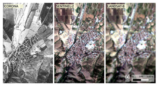 Comparison of the spatial resolutions of a 2.6m panchromatic Corona image acquired on 17 August 1968 (scene ID DS1104-2155DF040 available from the Earth Resources Observation and Science (EROS) website), a 10 m true-color representation Sentinel-2B image acquired on 29 August 2019 (scene ID S2B_MSIL1C_20190829T090559_N0208_R050_T35TLG_20190829T112604 available from the Copernicus Open Access Hub) and a 30 m true-color representation Landsat-8 image acquired on 21 August 2019 (scene ID LC81830312019233LGN00 freely available from the EarthExplorer website) over the settlement of Parvenets, Bulgaria. All image data sources presented are freely available to download from the respective sources.