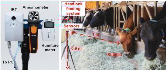 The multiple sensors architecture experiment setup is portrayed in Figure 2. The IRT, anemometer, and humiture meter were installed facing the cattle in the same direction. A computer was used to collect readings sent back from the sensors. Cattle core temperature was recorded using a thermometer with a probe as a reference for measuring error. As shown in Figure 2, the sensor was placed in front of the feedlot, and the necks of the cows were restrained by a headlock feeding system to ensure the cattle were stationary and their heads were not moving excessively during the measurement. The experiment was conducted in a covert area, so the surface temperature of the cattle was not affected by the sun [38]. Considering the factory default calibration setting and field of view of the Lepton, the IRT, anemometer, and humiture meter were all horizontally installed on the same tripod. The sensor was installed at a place with a height of 0.9 m and a distance of 1 m from the cattle. The experiment was conducted during the feeding time of the cattle, which was 10:00 AM to 02:30 PM every day, and the ambient temperature was 14–29 °C. At the same time, the ranch technician put a thermometer inside the anus of the cattle with a depth of 10 cm to record the rectal temperature. The breeds were Holstein and Jersey, readings were recorded repetitively 107 times. Considering the subsequent IRT signal processing, some of the environmental factors and body movements were deleted, and to ensure an adequate number of data were recorded and to reduce the effect of noises, each set of data took 90 s, which included IRT temperature, rectal temperature, wind speed, environmental temperature, and environmental humidity. Such a setup also considered the three types of factor that affected the IRT temperature. For reflection, the adopted IRT device was calibrated inside the factory, and the control unit of the device could accurately record the voltage level. For emissivity, the IRT lens was kept 1 m from the subjects and targeted at the heads, and without altering the materials and light exposure, the emissivity was set to 0.95. For the environmental factor, this was excluded to reduce negative influences on the IRT temperature.
