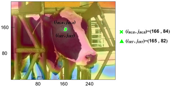 Our IRT device, the AD-HF048 manufactured by ADE, consists of a thermal image sensor and an optical image sensor. The former is the Lepton manufactured by FLIR with a resolution of 80 × 60-pixel, and fields of view (FOV) of 51° (horizontal) and 38.25° (vertical). Due to export control, the frames per second (FPS) is limited to 7. When temperature is between 30–45 °C, allowing the accuracy to be ±0.75 °C, and the thermal sensitivity is less than 0.05 °C according to the manufacture datasheet [40]. For the convenience of observation, a 200-megapixel camera, with a FOV of 65° (horizontal) and 40° (vertical), was included in our setup to cohere with the FOV of the IRT. Optical devices were not required during the experiment. Indicated in Figure 3, optical images and IRT images were overlayed to determine that the cattle’s lacrimal glands matched the location of the highest surface temperature. As the resolutions of the two sets of images were both 320 × 40 pixels, (iIRT, jIRT) and (iRGB, jRGB), locations of the lacrimal gland, and (165, 82) and (166, 84), locations of the highest surface temperature, were almost perfectly overlayed. The anemometer in the experiment was 410i manufacture by TESTO, which records wind speed per second and is connected to other devices through Bluetooth. The sensing range of 410i is 0.4–30 m/s, with an accuracy of ±0.2 m/s and a resolution of 0.1 m/s. The humiture meter in the experiment was an RC-4HA manufactured by Elitech, which records data through USB connection. Every 10 s the meter records data including environmental humidity and temperature. The sensing range of environmental temperature is −30–+60 °C. The accuracy is ±0.5 °C and resolution 0.1 °C under the range between −20 – +40 °C. The environmental humidity range is 0–99% RH. The accuracy is ±3% RH and resolution 0.1% RH under 25 °C and 20–90% RH. The thermometer in the experiment was an RC-4HC manufactured by Elitech. The sensing specification of RC-4HC is identical to that of the RC-4HA. The difference is that RC-4HC includes a waterproof probe, with a sensing range between –40–+85 °C. In this research, all the hardware of the multiple sensors architecture is listed in Table 1.
