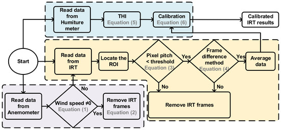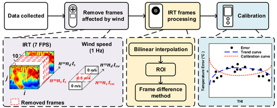 The block diagram of this research is shown in Figure 4, which indicates the removed frames because of wind, IRT frame processing, and temperature calibration. The detailed information of the signal processing flow is shown in Figure 5. The auxiliary sensors cooperated with IRT and provide a decision to prune IRT frames which were affected by the environment. These decisions will be described below.