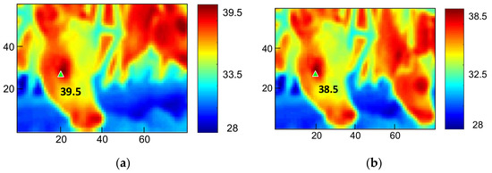 Whether pixel pitches are smaller than the threshold should be determined only if the ROI is greater than 1; if the pixel pitches are greater than the threshold, that frame should be removed. Therefore, Figure 8a does satisfy Equation (3). Figure 8b shows two cows entering the FOV, and pixels higher than 37 °C are marked as green triangles. The resolution of the two pixels pitches is lower than 124 pixels and does not satisfy Equation (3). Nonetheless, IRT images were affected because in the experiment the cattle were eating and the swing of heads might blur images or disrupt airflows. In response to this issue, we adopted the frame difference method to deduct the temperature of two consecutive frames to determine whether the difference fitted the threshold. The discriminant is: