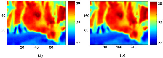 Next, IRT frames were processed. The procedures included image enhancement and re-adjustment of color maps for the distribution of color scales for easier observation. Then all frames underwent resampling with bilinear interpolation to solve the raster images caused by insufficient resolution at edges. As shown in Figure 7a, a new pixel was calculated by the weighted average of attributes of four-pixel pitches from the point to be interpolated. Such a method is used to acquire a larger image. As indicated in Figure 7b, the resolution was enlarged from 80 × 60 pixels to an equivalence of 320 × 240 pixels. Although a bigger-sized image sensor can obviously obtain images with higher resolution, we still used a smaller-sized one for better accessibility and lower costs. Interpolation can enhance resolution and improve the subsequent ROI determination and frame difference method, but the contour may be blurred due to the low-pass filtering effect. This research, however, does not require a clear contour for object recognition, and that is why a trade-off was inevitable.