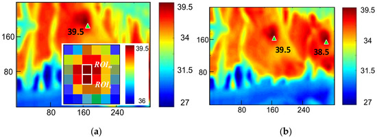 In previous sections, we have discussed that the highest-temperature spot in an IRT image is the eye socket; however, as indicated by experimental results, the determination might be confused if adjacent bodies of cattle moved inside the IRT FOV even if the lens was aimed at the target cattle. Therefore, we would like to ensure that an image only contains one single object. When multiple ROI images were captured, distances between the images were calculated to determine whether they satisfied the pixel patch threshold preset by the software. If the threshold was passed, more than one cow was recorded and that frame was removed. Figure 8a is an image containing only one cow, and the snapshot is a 6 × 6 diagram of the highest temperature spot. Two pixels were higher than 37 °C, and they were designated to ROIm and ROIk, respectively. The cause of such a phenomenon was the projection angle of the reception of IR and IRT sensors, and the image was dispersed to adjacent pixels. The hardware in Chapter 2 was used with triangle similarity. Assuming the length of the cattle’s eyes being 4 cm, a 4 cm object occupied 4 pixels on the screen captured by the IRT image sensor, which was 1 m from the target. Thus, the pixel pitch threshold was equivalently designated 16 pixels, and the condition was: