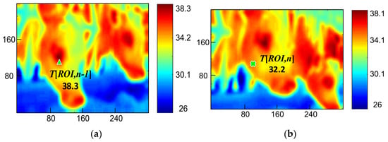 where the ROI is designated to the location of frame n−1. Figure 9 indicates how one cow moved continuously in an image, and Figure 9a is the detection of frame n−1. T[ROI,n−1] was 38.3 °C, and T[ROI,n] in Figure 9b was 32.2 °C. The temperature difference of the ROI image with stationary cattle should approach 0 °C; otherwise, that frame should be removed. Substituting data in Figure 9 into Equation (4) found that the temperature difference was approximately 6.1 °C, and the frame was removed because the result was over the threshold. The result also indicates that ROI images will be re-defined if the measurement results do not satisfy Equations (1) and (4).