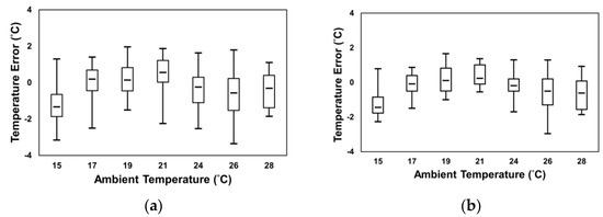 Temperature error versus the ambient temperature (a) before (b) after IRT frame processing.