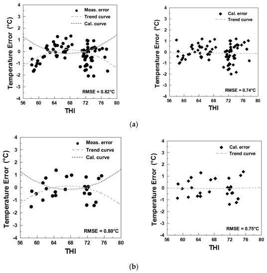 The photography of the experiment for non-invasive cattle body temperature monitoring is shown in Figure 10, in which you can see those sensors were mounted on a tripod. A PC was connected to sensors via RJ45 cable and Bluetooth while running Matlab. According to the hardware parameters and data analysis methods discussed in previous chapters, the IRT data length was less than 90 s because some data were removed after the IRT frame processing. To determine the correlation between ambient temperature, IRT temperature, and rectal temperature and also to observe how the IRT frame processing improved the measurements, Figure 11 displays temperature errors under different ambient temperature in a box plot. For easier observation, data retrieved by the IRT and reference thermometers were averaged every 10 s. The original errors are shown in Figure 11a, where the temperature error is the difference between IRT temperature on ROI and rectal temperature. After IRT frame processing, the overall errors were significantly reduced, as compared to data in Figure 11b. When the ambient temperature was 21 °C, original data errors were ±2 °C, and the median 0.55 °C. The processed temperature errors were approximately ±1 °C, and the median was 0.235 °C. Furthermore, with the calibration method proposed by this research randomly categorized 107 entries of data to 80 training sets and 27 validation sets to acquire the calibration curve and evaluate the results of calibration. The data before and after the calibration are listed in Figure 12a. The image to the left is the calibrated 80 training sets. The horizontal axis is the THI, and the vertical axis is the temperature error. This scatter plot shows that the THI data are mostly distributed between 72–80, and such distribution was fitted to a quadratic trend curve, where the measured error, calibrated error, trend curve, and calibration curve were represented by circle, diamond, dotted line, and dashed line, respectively. This trend curve is designated Equation (6):