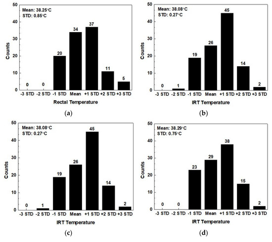 Finally, we calculated the average and standard deviation of the results acquired in each procedure. Figure 13 records the distribution of 107 entries of data to find the discrete levels of the readings of the IRT and the rectal thermometer. Figure 13a is the histograms of data distribution of rectal temperature with a thermometer. The mean is 38.25 °C, and the STD 0.85 °C. Figure 13b is the original data distribution using the IRT. The mean is 38.08 °C, and the STD 0.27 °C. Temperature difference exists in the original measurement results. The mean difference of the measurements acquired by the two sensors is 0.17 °C, and the STD difference 0.58 °C. The IRT frame processing is performed on the results of Figure 13b and is recorded as Figure 13c, the results of which shows a mean of 38.08 °C, and an STD of 0.27 °C without changing the original data distribution. The calibrated distribution graph is displayed by Figure 13d. The mean is 38.29 °C, and the STD 0.75 °C. The mean difference from the rectal temperature in Figure 13a is 0.05 °C, and the STD difference is 0.13 °C. In short, the distribution of the IRT is close to that of the rectal thermometer.