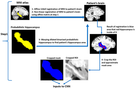 Atlas-based segmentation of the hippocampus involves the following sequential processes: (1) linear alignment of the Montreal Neurological Institute (MNI) brain atlas to the individual brain scans; (2) non-linear registration of the MNI atlas to the T1-weighted image; (3) warping the dilated binarized mask of the hippocampus to the patient space; and (4) cropping the region of interest.