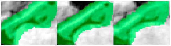 According to protocol, the cut line between the amygdala and hippocampus at the rostral level can be recognized by segmenting gray matter below the alveus and at the caudal level by separating the last grey matter mass inferomedial to the lateral ventricles. The protocol suggests using 2D orthogonal views (axial, sagittal, and coronal planes) for optimal tracings. This recommendation relates to the similarity of tissue intensity of the surrounding tissues, in which case visualization in the different orthogonal views can help to assess the continuity of the structures, aiding segmentation, especially at the medial boundary of the hippocampus, where the grey matter is difficult to delineate based on only voxel intensity information. The ADNI-HarP protocol was agreed upon by a panel of experts from North America and Europe and is accepted as the standard systematic method for hippocampal manual segmentation [21,22].