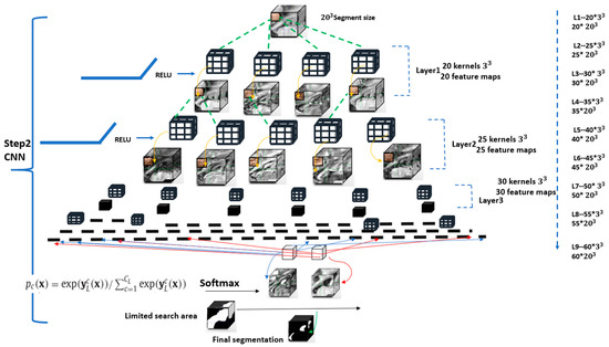 In the final setup, the number of feature maps started at 20 and increased by increments of five in each layer up to a maximum of 60 in the final layer. For the training stage, a batch size of 20 and 10 epochs were used to train the network by minimizing the cross-entropy loss function. Small 3 × 3 × 3 kernels were applied, which reduces the number of network parameters [31]. A funnel shape network was used because it has been shown to lead to superior performance [33] compared to networks with other shapes using the same number of parameters. The learning rate hyperparameter was initially set to 0.006 and steadily diminished until the validation accuracy plateaued. The L1 and L2 regularization terms were set to 0.000001 and 0.0001, respectively. Dropout was used to reduce the risk of model overfitting [31].