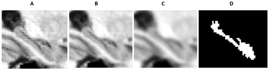 An augmented hippocampal ROI of the medial temporal lobe, using progressive Gaussian blurring, original ROI (A) (blurring with sigma 0.5 (B), with sigma 1.0 (C)) and corresponding ground truth segmentation (D).