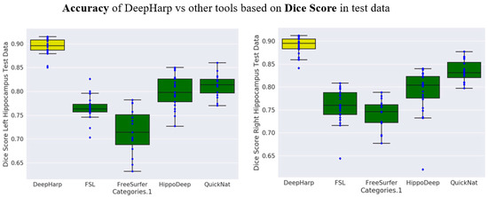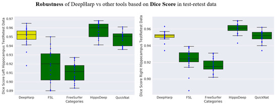 Comparison of DeepHarp robustness (based on Dice score) with common tools and state-of-the-art methods for hippocampus segmentation.