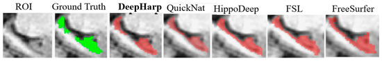 Comparison of segmentations for different tools for a selected patient and slice. It can be seen that Freesurfer and FSL show more false positives than other tools at the head of hippocampus. Freesurfer also has more false negatives at the tail than other tools.