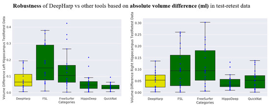 Comparison of DeepHarp robustness (based on absolute volume difference) with common tools and state-of-the-art methods for hippocampus segmentation.