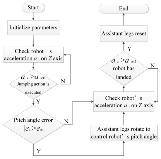 The working process of jumping robot’s control system. aset1 and aset2 are two set values of acceleration. ep and eset are the measured value and set value of pitch angle error, respectively, and 0° is the expected value of pitch angle.