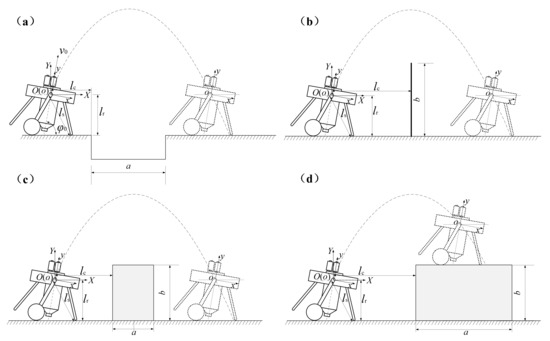 The schematic diagram of jumping robot’s overcoming different obstacles. (a) Jumping robot jumps over ditch. (b) Jumping robot jumps over wall. (c) Jumping robot jumps over platform. (d) Jumping robot jumps onto platform.