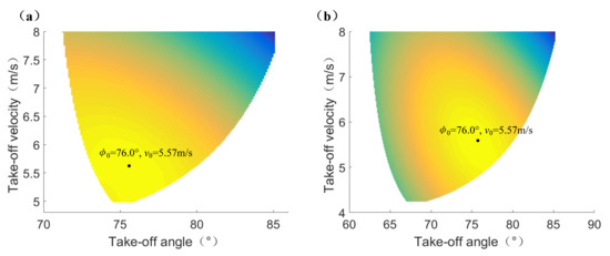 The optimization results of theoretical jumping trajectory. (a) The optimum take-off parameters for jumping onto the platform. (b) The optimum take-off parameters for jumping over the platform.